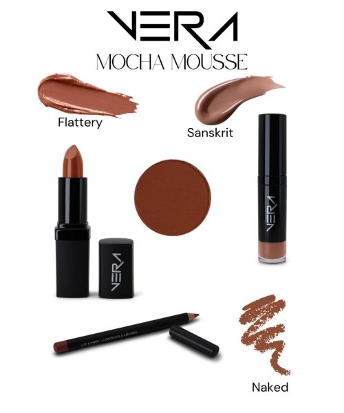 Embrace the rich sophistication of Mocha Mousse, the Pantone Color of 2025, with a trio of timeless neutrals. The Flattery lipstick offers a creamy, full-coverage nude brown-taupe that exudes understated elegance. Layer it with the Sanskrit lip gloss, a soft nude mauve with brown undertones, for a touch of luminous warmth. Define and perfect your look with the Naked lip pencil, a smooth nude cocoa liner that enhances your lips with subtle precision. Together, these shades harmonize to embody the refined, modern essence of Mocha Mousse.